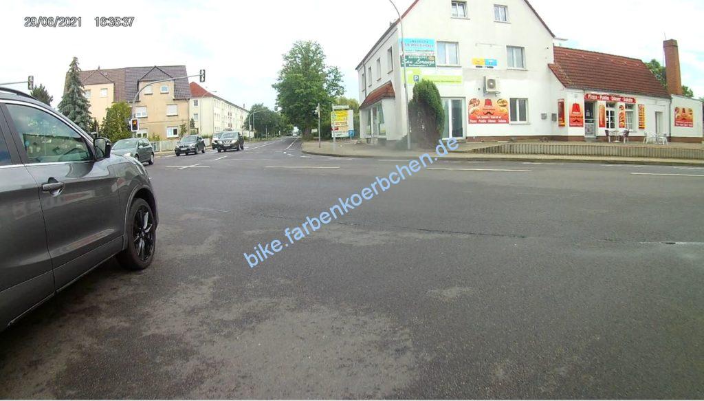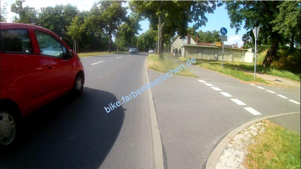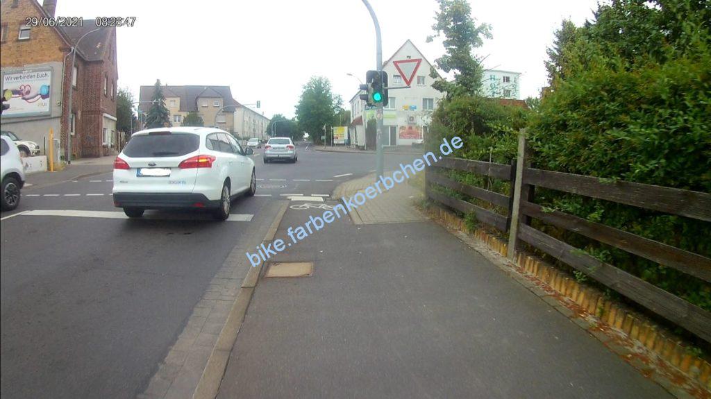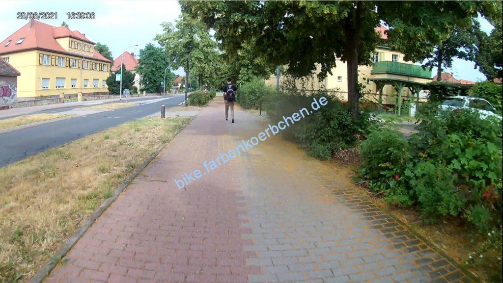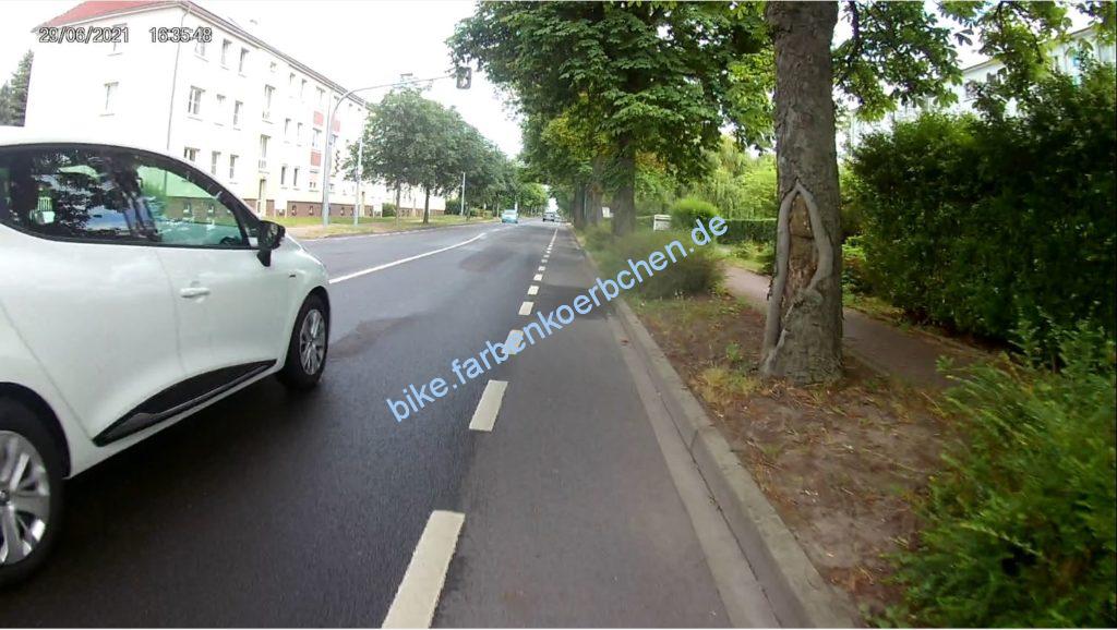 Gleich früh und am Nachmittag kaum besser – der Fahrer im weißen PKW(Bild 1) hat erst in dieser Position begonnen zu blinken. Bloß gut, das der Wille abzubiegen und meine Vorfahrt zu mißachten an der Fahrweise erkennbar war. Der Fußgänger ist keinen mm zur Seite gegangen, trotz mehrfachen klingeln – Handy war augenscheinlich wichtiger.
