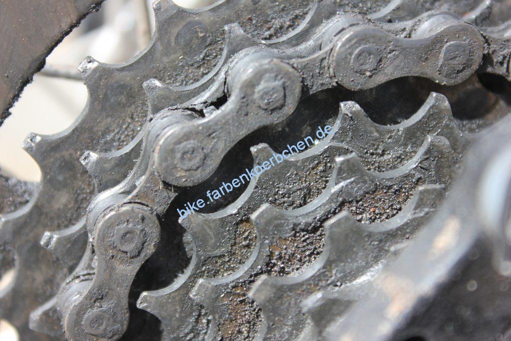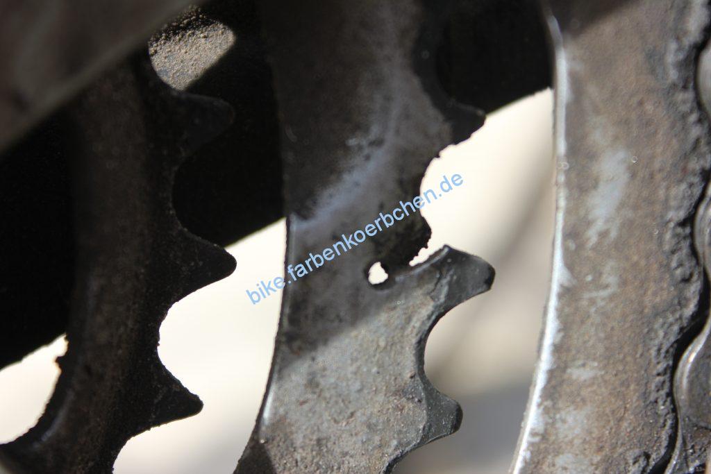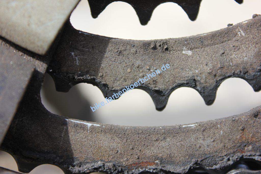 Es ist nun an der Zeit, das Knarren der Kurbeln nimmt wieder zu, die Ritzel haben sozusagen Biss-Spuren, vorn hat das mittlere Ritzel 2 tiefe Risse – es ist an der Zeit für eine Komplett-OP. Dazu kommt, dass bei der linken Kurbel das Gewinde zum Abziehen defekt ist – es macht also auch von der Seite her Sinn. Die Kette hat auch schon einiges hinter sich und damit genaugenommen überfällig.