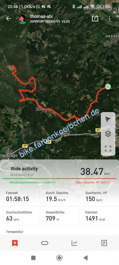 Von da bin ich ohne Pause auf den Brocken gefahren, das waren 19,5km, die ich in 1h 20 min gefahren bin – nach einer 30 minütigen Pause ging es wieder Richtung Auto – Fahrzeit waren 40 min. 2,5h insgesamt ist ein für mich zumindest ein ziemlich guter Wert.