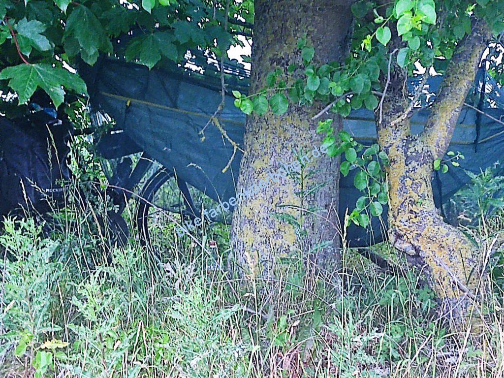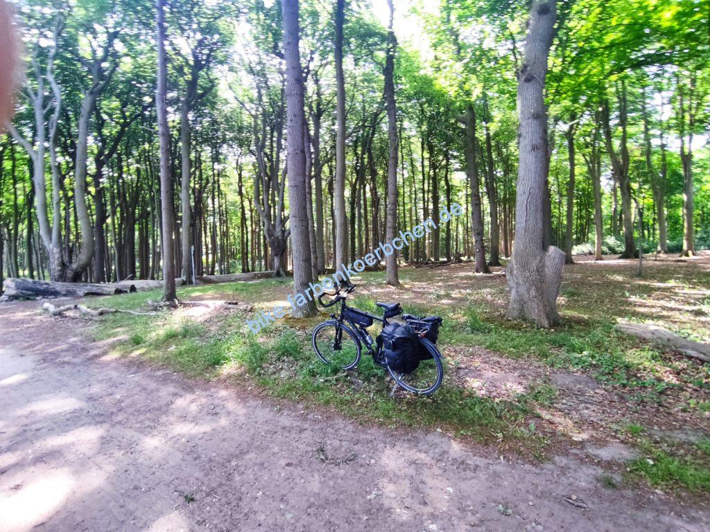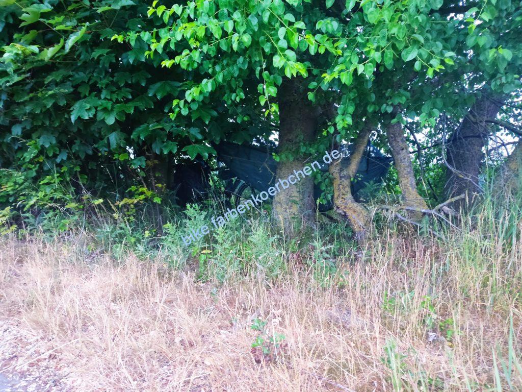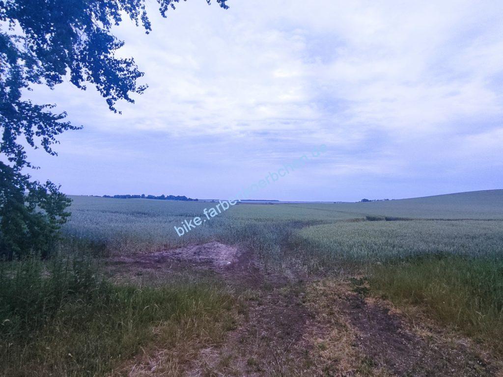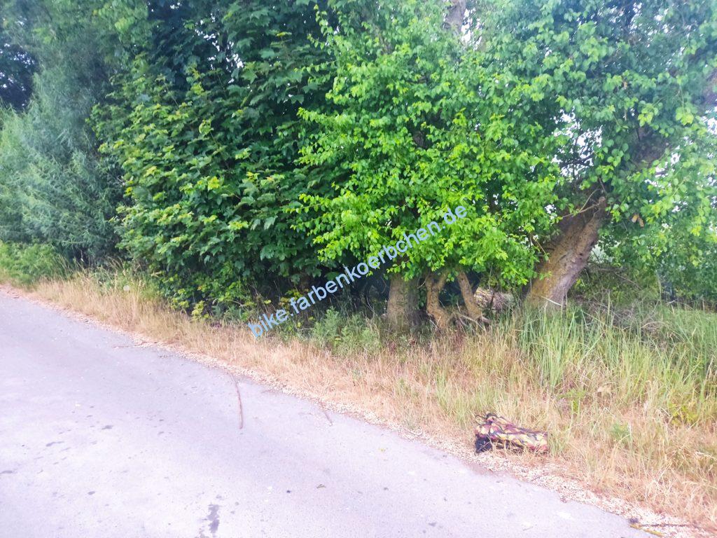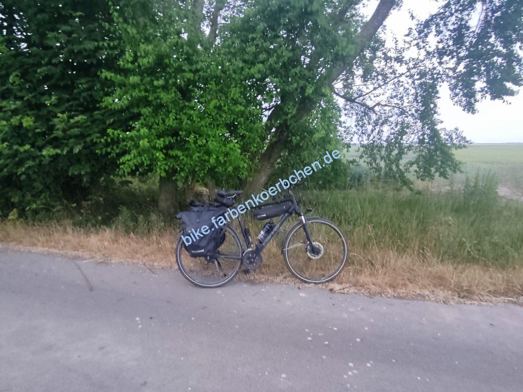 Mein Schlafplatz war an diesem Tag Verzweiflung, denn ich hätte noch ca. 10km weiterfahren müssen, aber das war wegen der fortgeschrittenen Zeit nicht mehr machbar. So war es dann ein Baum/Strauchstreifen am Feld, wo ich die Hängematte unterzubringen hatte. Selbst das ging ganz gut, Stirnleuchte hat gute Dienste geleistet, denn beim Aufbau war es dunkel, die Fotos entstanden am nächsten Morgen. Die Nacht war ruhig, es gab leichten Regen, aber das Tarp hat alles trocken gehalten. Weiter gehts an Tag 4.